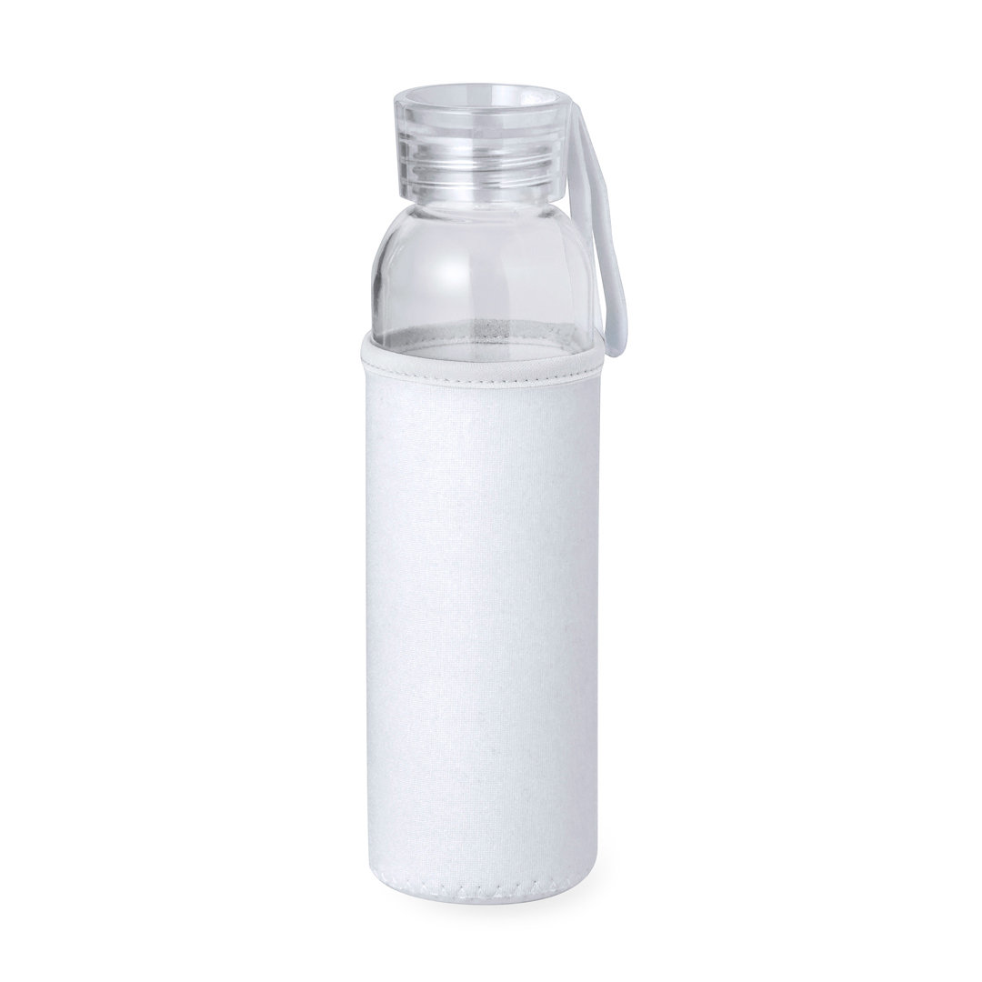 Bidón de 500 ml de capacidad. Cuerpo fabricado en cristal, con tapón a rosca y práctica asa de silicona para un fácil transporte. Incluye funda de soft shell a juego. Disponible en variada gama de colores y presentado en caja individual de atractivo diseño kraft. 500 ml. Funda Soft Shell