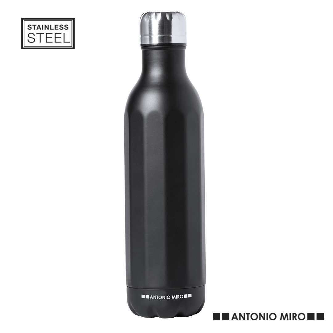 Bidón en acero inox de Antonio Miró. De 750ml de capacidad y sobrio acabado en negro satinado, con cuerpo prisma y logotipo de la marca en la base. Con tapón cromado a rosca y presentado en atractiva caja de diseño con logotipo de la marca. 750 ml