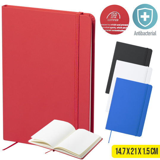 Bloc de notas tamaño A5 con tapas antibacterianas rígidas de polipiel.Disponible en variada gama de colores, con encuadernación cosida. Con banda elástica de cierre y marcapáginas a juego. Incluye 96 hojas de papel lisas en color crema, calidad 70g/m2.Los productos con tratamientos antibacterianos son capaces de reducir drásticamente las cargas bacterianas presentes en las superficies de los materiales, gracias a la incorporación de agentes microbianos permanentes estáticos, con alta efectividad para inhibir y prevenir la contaminación bacteriana.Artículo de acuerdo al estándar ISO 22196, que determina la actividad antibacteriana en materiales plásticos y superficies no porosas, lo que permite conocer la efectividad de inhibición microbiana que tienen los aditivos sobre los objetos tratados mediante una evaluación cuantitativa. Portada Rígida. 100 Hojas