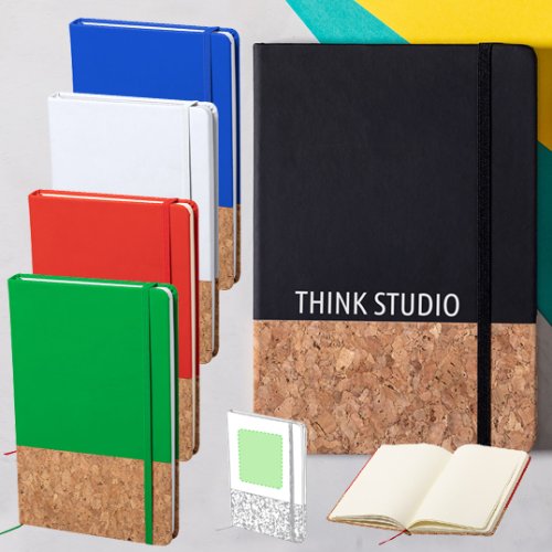 Bloc de notas de línea nature en combinación de corcho natural con polipiel de tapas rígidas. Con 100 hojas lisas con acabado natural, elástico de sujeción y marcapáginas de tela a juego. Disponible en variada gama de colores. Portada Rígida. 100 Hojas