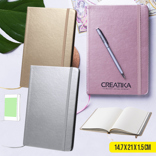 Bloc de notas en polipiel de llamativos colores metalizados. Disponible en colores dorado, plateado y oro rosa. Con tapas rígidas, elástico de sujeción y marcapáginas de tela a juego. Incluye 80 hojas lisas con acabado en color natural. Portada Rígida. 80 Hojas