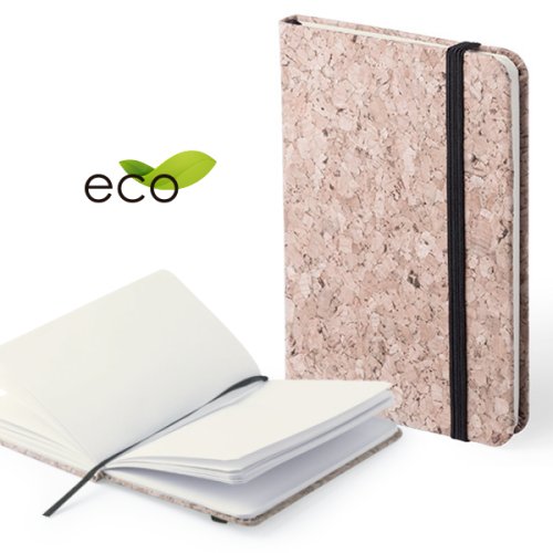Bloc de notas con tapas de suave tacto acabadas en corcho natural. De 80 hojas lisas, con elástico de sujeción y marcapáginas de tela a juego. Portada Rígida. 80 Hojas