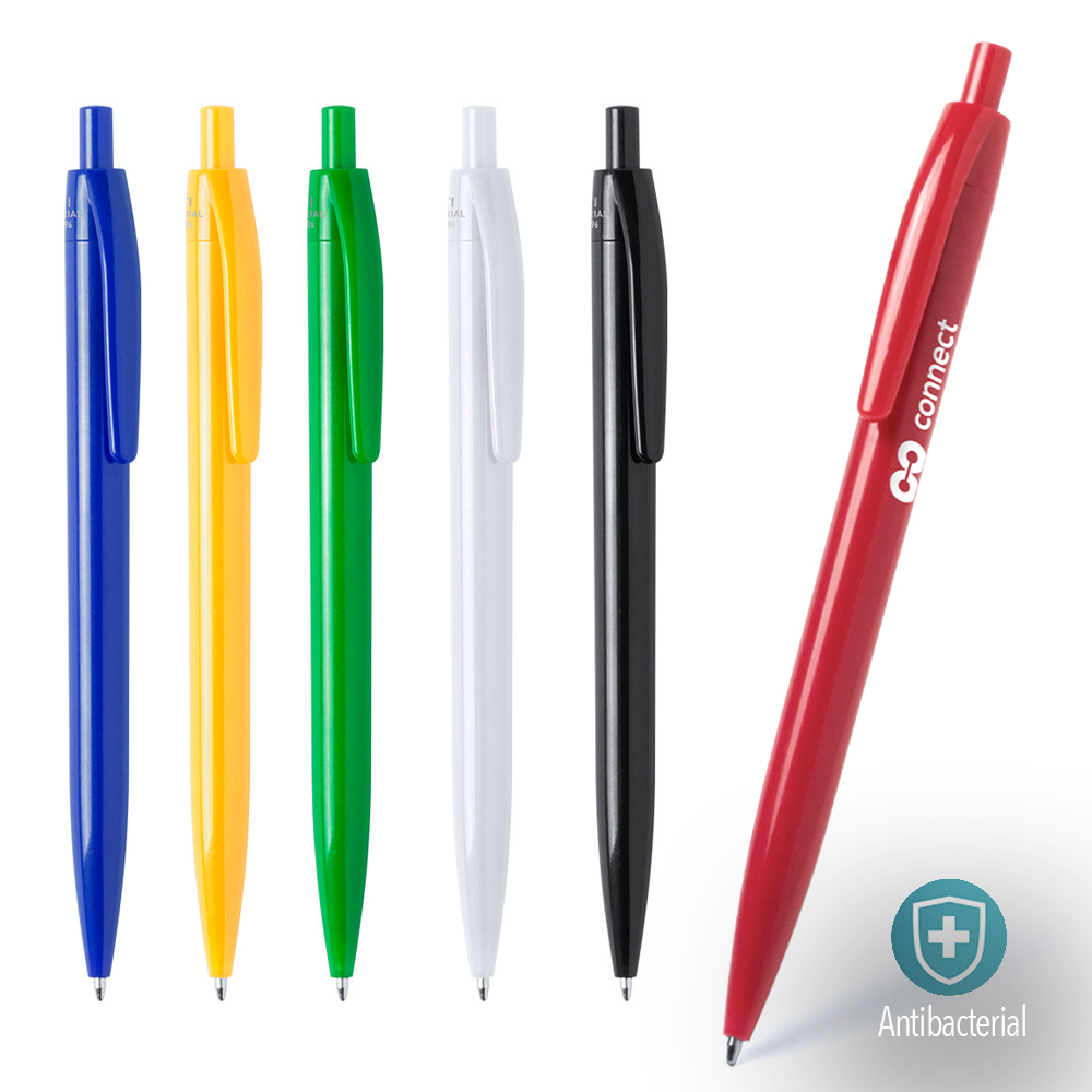Bolígrafo antibacteriano de mecanismo pulsador. Diseño monocromático, en variada gama de colores con acabado brillante, especialmente diseñado para marcaje en tampografía. Tinta azul. Los productos con tratamientos antibacterianos son capaces de reducir drásticamente las cargas bacterianas presentes en las superficies de los materiales, gracias a la incorporación de agentes microbianos permanentes estáticos, con alta efectividad para inhibir y prevenir la contaminación bacteriana. Artículo de acuerdo al estándar ISO 22196, que determina la actividad antibacteriana en materiales plásticos y superficies no porosas, lo que permite conocer la efectividad de inhibición microbiana que tienen los aditivos sobre los objetos tratados mediante una evaluación cuantitativa.