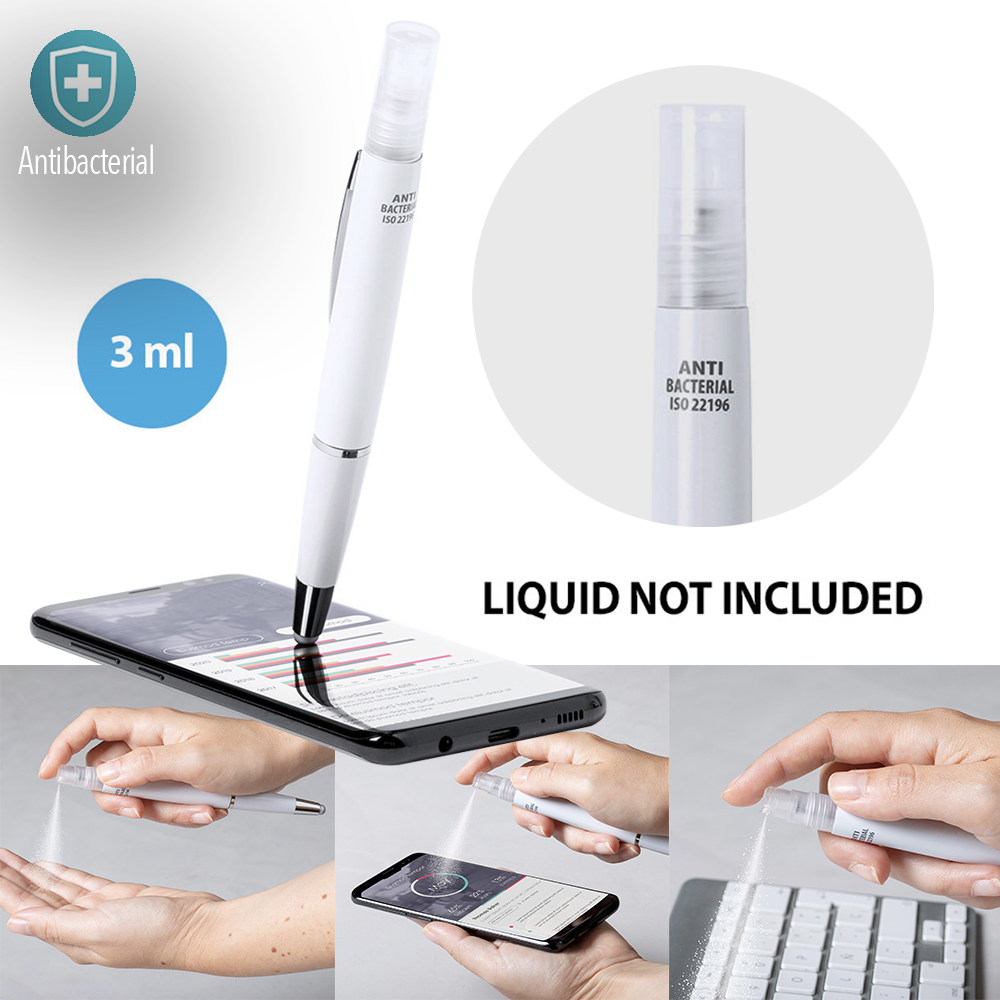 Bolígrafo antibacteriano con pulverizador recargable integrado y capucha protectora, incluye puntero en color gris. Acabado liso en resistente ABS brillante con elegante clip metálico y escritura en tinta azul. Capacidad del pulverizador 3ml. Líquido no incluido.Los productos con tratamientos antibacterianos son capaces de reducir drásticamente las cargas bacterianas presentes en las superficies de los materiales, gracias a la incorporación de agentes microbianos permanentes estáticos, con alta efectividad para inhibir y prevenir la contaminación bacteriana.Artículo de acuerdo al estándar ISO 22196, que determina la actividad antibacteriana en materiales plásticos y superficies no porosas, lo que permite conocer la efectividad de inhibición microbiana que tienen los aditivos sobre los objetos tratados mediante una evaluación cuantitativa. 3 ml. Líquido No Incluido