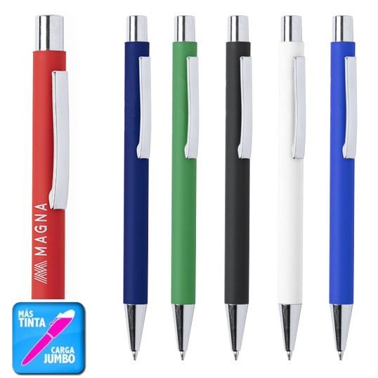 Original bolígrafo de mecanismo pulsador en elegante diseño bicolor. Con cuerpo de aluminio en tacto goma de acabado mate. Especialmente diseñado para marcaje en láser y mostrar el logotipo en tono plateado. Clip, parte superior y punta en plateado. Disponible en variada gama de colores, con cartucho jumbo y tinta azul. Carga Jumbo