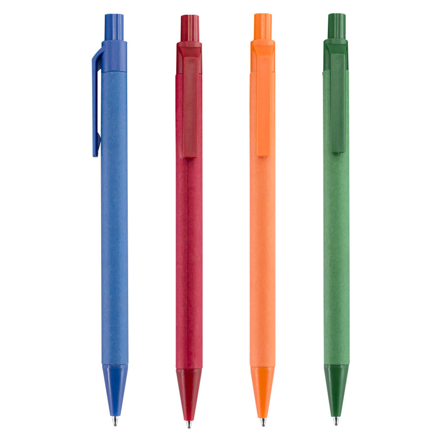 Bolígrafo Ecológico con cuerpo de cartón reciclado de color, con terminales de plástico de color PET biodegradable. Escritura Azul.