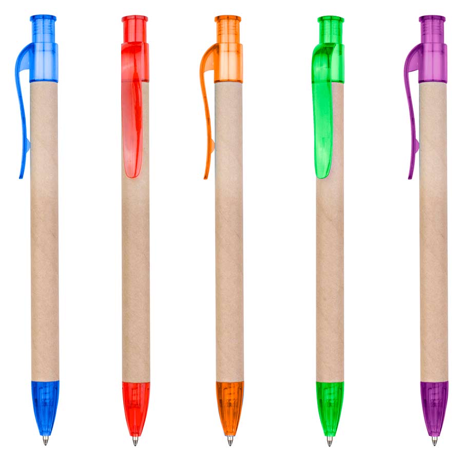 Bolígrafo Ecológico "Planet" de cartón reciclado, con terminales de color traslúcido. Escritura azul.
