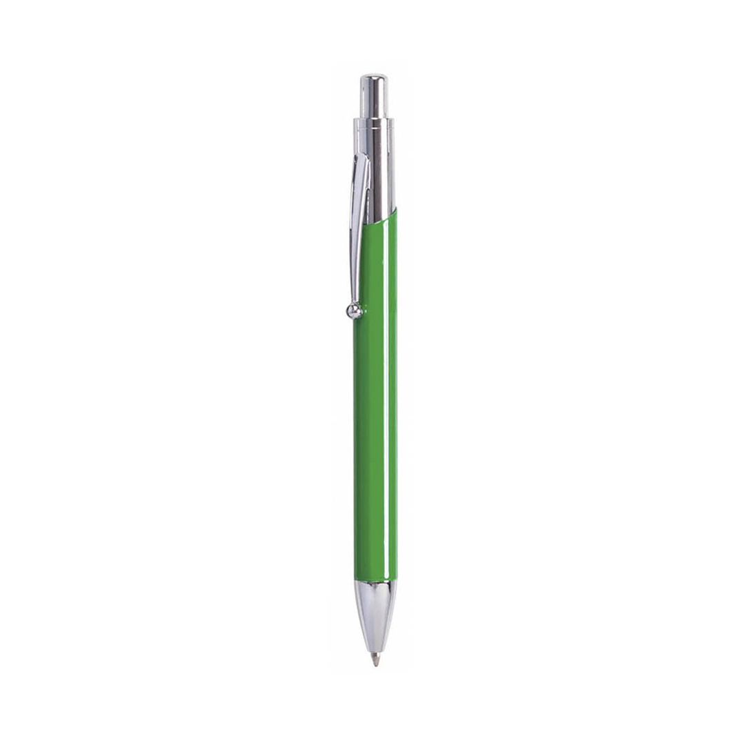 Bolígrafo de mecanismo pulsador en original diseño bicolor. Con cuerpo metálico de suave acabado en alegres colores. Punta y clip en plateado. Presentado en funda de polipiel a juego. De cartucho jumbo y tinta azul. Carga Jumbo. Funda Polipiel