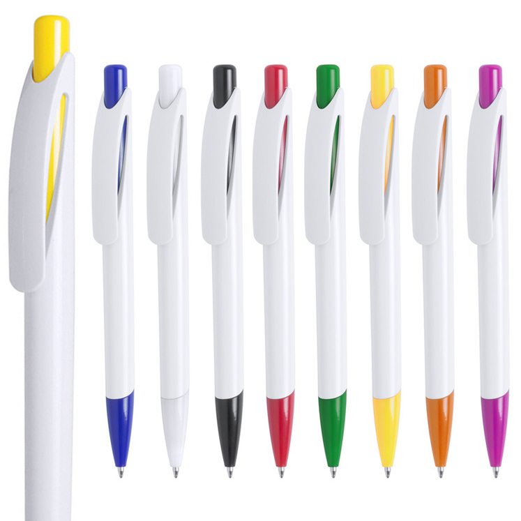 Bolígrafo de mecanismo pulsador de atrevido diseño bicolor con accesorios en vivos colores sólidos y cuerpo de suave acabado en color blanco sólido. Con original clip curvado a y punta a juego. Tinta azul.