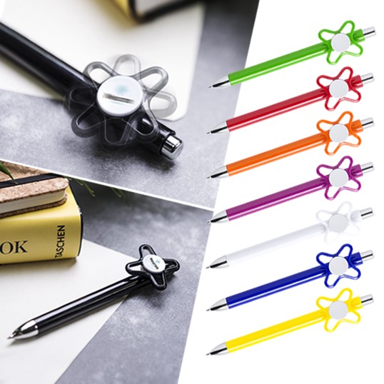 Original bolígrafo spinner antiestrés de mecanismo pulsador y divertido diseño con accesorios en color plateado y cuerpo de acabado sólido en colores brillantes. Especialmente diseñado para tampografía en clip y en cuerpo. De cartucho jumbo y en tinta azul. Carga Jumbo