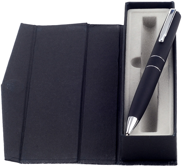 Metal. Cuerpo metálico engomado. Clip y detalles color plata. Tinta negra. Estuche con cierre magnético. Área de impresión: Ø 0,8 x 5 cm. Destape electroplateado en la parte superior. Presentación en estuche con cierre magnético.