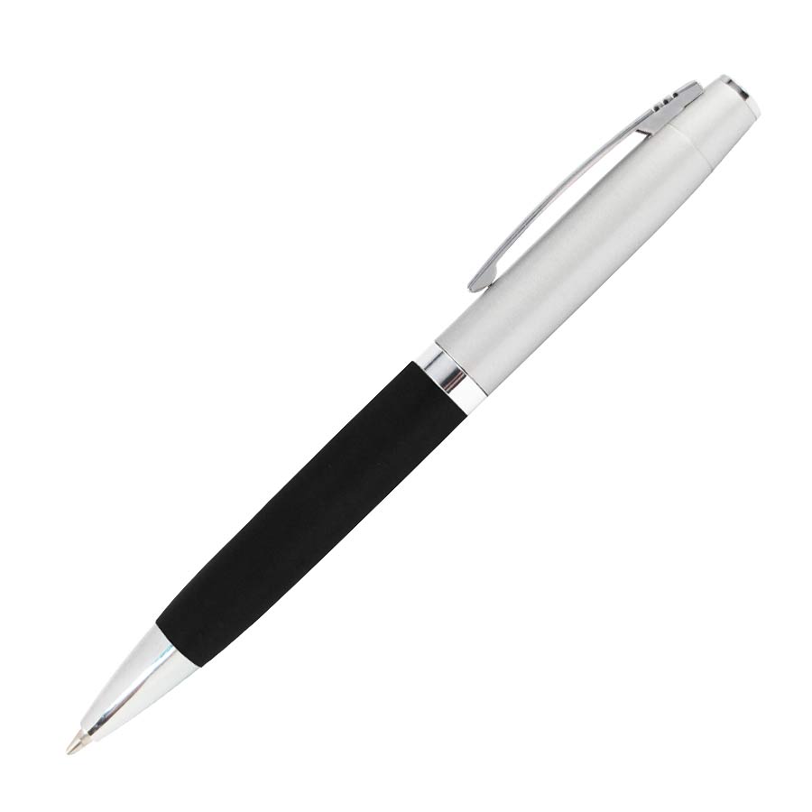 Bolígrafo Metálico bicolor modelo "Chairman". Cuerpo inferior superficie engomada negra, cuerpo superior plata satinado, terminales cromados. Escritura negra.