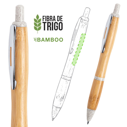 Bolígrafo con mecanismo pulsador de línea nature. Cuerpo en bambú, con pulsador y punta en caña de trigo, para así fomentar la utilización de materias primas naturales y reducir las emisiones contaminantes. Con original clip metálico troquelado y cómoda empuñadura de bambú. De cartucho jumbo y en tinta azul. Carga Jumbo