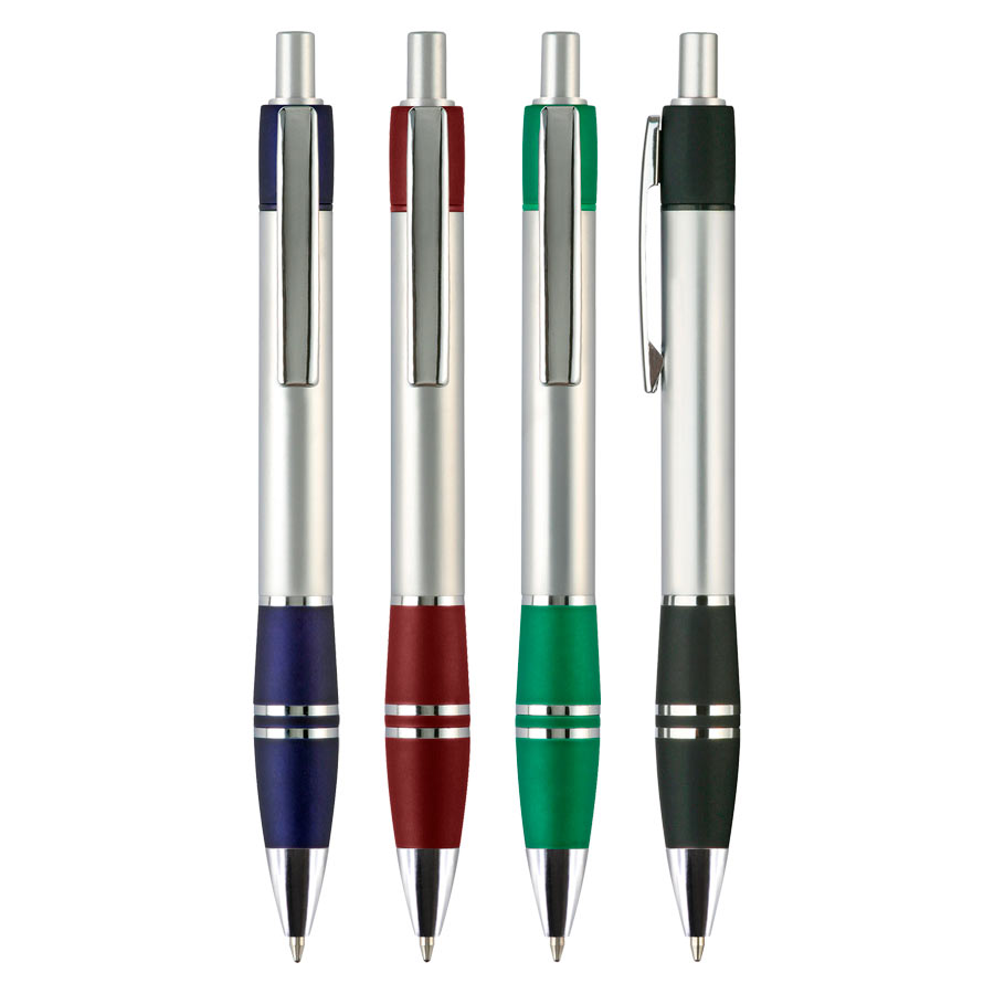 Bolígrafo plástico metalizado "Active" con goma anti-deslizante de color. Escritura Azul.