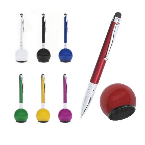 Original bolígrafo puntero con base limpiadora de pantallas incluida, de mecanismo giratorio y suave cuerpo en vivos colores. Limpiapantallas Incluido