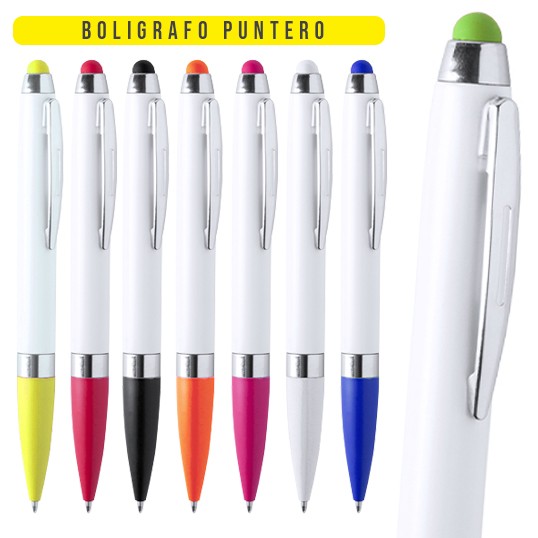 Bolígrafo puntero de colorido diseño, con cuerpo en elegante color blanco sólido. Empuñadura y puntero a juego, con detalles cromados. Tinta azul.