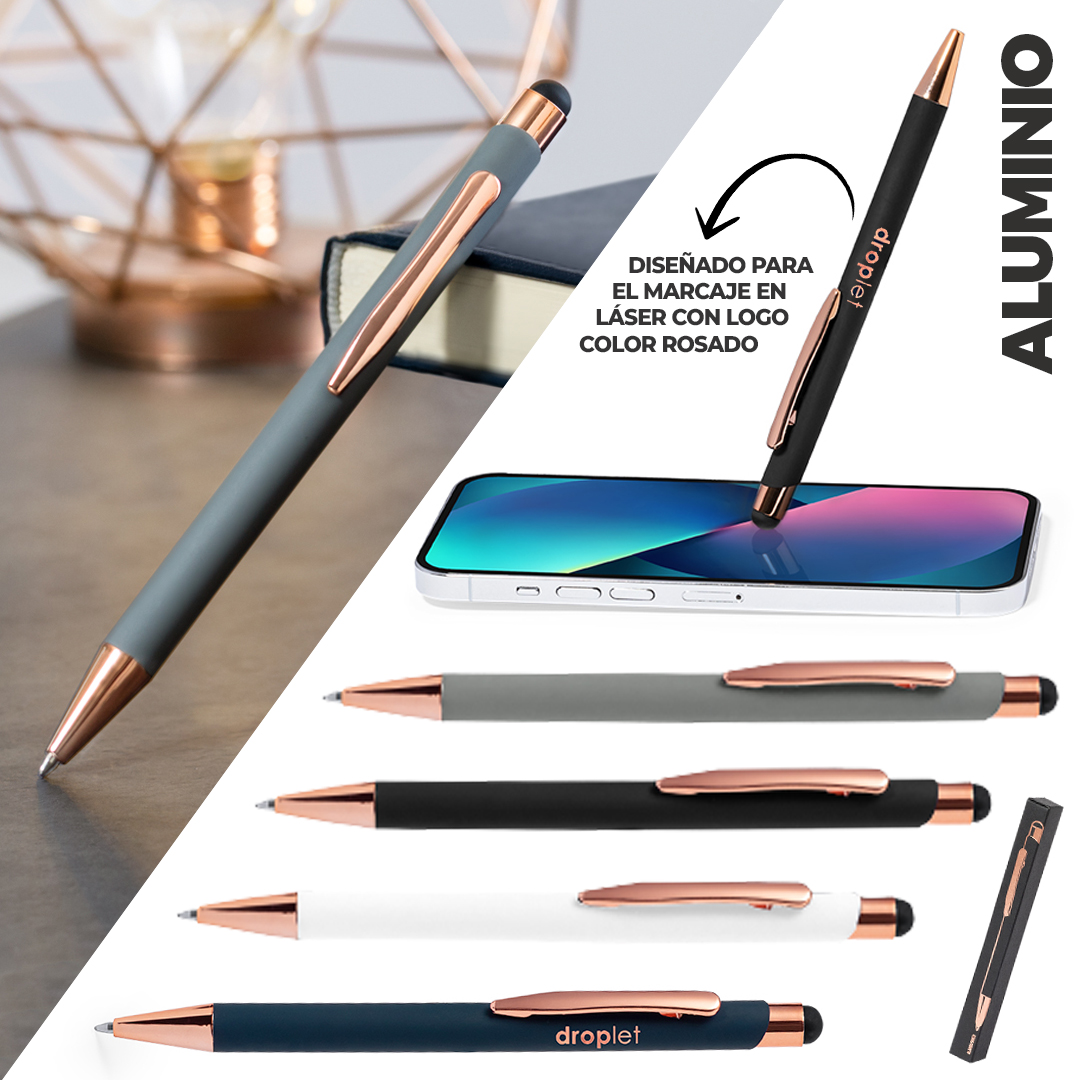 Bolígrafo puntero de tacto goma especialmente diseñado para el marcaje en láser con logotipo en color rosado. De mecanismo pulsador, con clip metálico y accesorios en acabado cobre. Cuerpo disponible en 4 distinguidos colores, de cartucho jumbo y en tinta azul.Presentado en elegante caja de diseño negra. Carga Jumbo