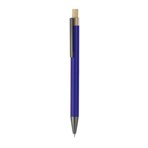 Bolígrafo de mecanismo pulsador fabricado en Aluminio reciclado. Pulsador en bambú y cuerpo gris acabado mate. Clip y punta en negro. De carga jumbo y en tinta azul.