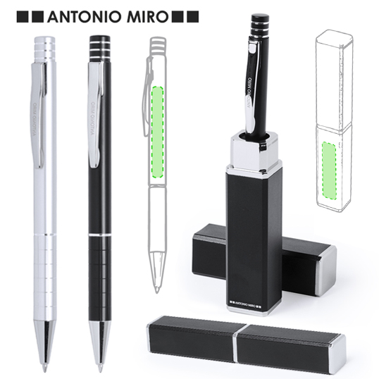 Bolígrafo de Antonio Miró de elegante diseño y suave cuerpo en aluminio con accesorios en color plateado. De mecanismo pulsador, con parte superior anillada, original clip metálico y presentado en estuche individual de aluminio negro con logotipo de la marca. Tinta azul.