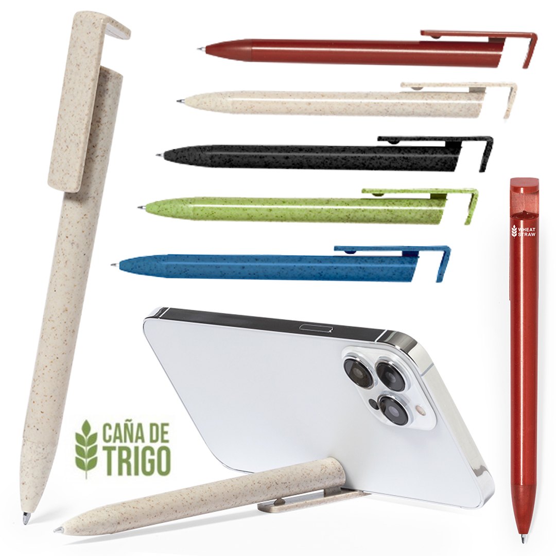 Elegante y práctico bolígrafo fabricado en caña de trigo y ABS. De mecanismo pulsador, con soporte integrado en clip para dispositivo móvil. En tinta azul y con distintivo Wheat Straw en la parte superior del bolígrafo.La caña de trigo fomenta la utilización de materias primas naturales, reduciendo así las emisiones contaminantes.