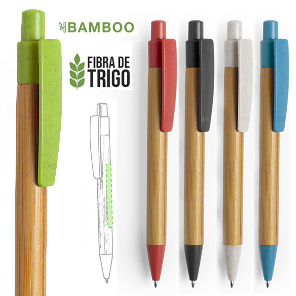 Bolígrafo con mecanismo pulsador de línea nature. Cuerpo en bambú, con accesorios a juego en caña de trigo, para así fomentar la utilización de materias primas naturales y reducir las emisiones contaminantes. Original clip tamaño XL y disponible en variada gama de colores y en tinta azul.