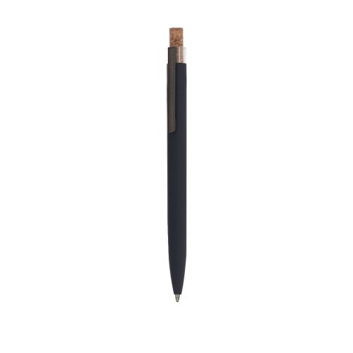 Bolígrafo de mecanismo pulsador fabricado en aluminio reciclado. Pulsador en corcho y cuerpo acabado goma, especialmente diseñado para marcaje en láser. Clip metálico y distintivo aluminio reciclado en la parte superior del bolígrafo. De cartucho jumbo y en tinta azul. El aluminio reciclado es un material con posibilidades de reciclaje casi infinitas, sin perder sus propiedades originales y consumiendo menos energía en este proceso.Certificación GRS (Global Recycled Standard / Estándar de Reciclaje Global), que garantiza el origen reciclado del material usado para fabricar el producto. Carga Jumbo