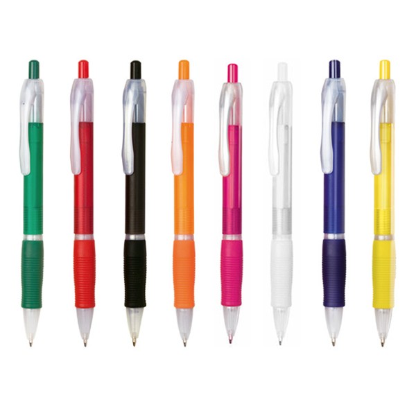 Clásico bolígrafo con mecanismo de pulsador, de atrevido diseño bicolor y cuerpo en colores frosted de suave acabado. Con cómoda empuñadura a juego. Tinta azul.