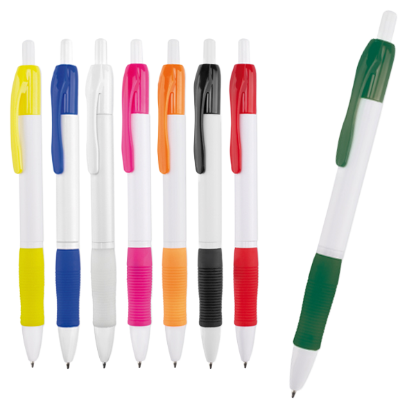 Clásico bolígrafo con mecanismo de pulsador, de atrevido diseño y cuerpo de color blanco sólido en suave acabado. Con cómoda empuñadura y clip a juego. Tinta azul.
