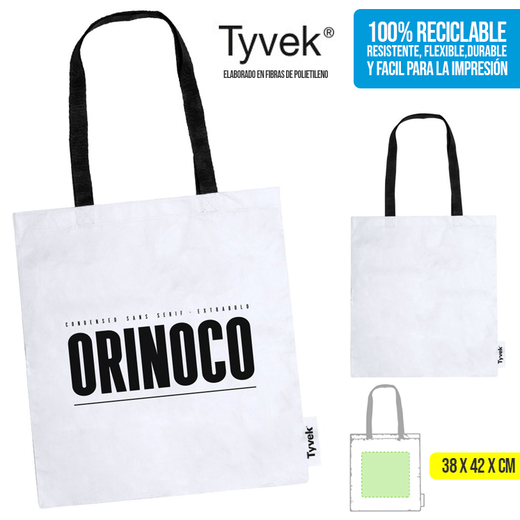 Bolsa en suave y ligero material Tyvek®, 100% reciclable y elaborado a partir de fibras de polietileno, que destaca especialmente por su resistencia, flexibilidad, durabilidad y facilidad para la impresión. Con asas largas en color negro de 70 cm reforzadas y resistencia de hasta 7 kg de peso. Con distintivo Tyvek® en etiqueta lateral.