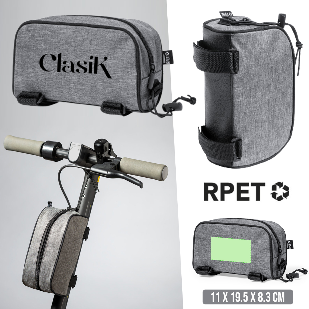 Bolsa para barra de patinete fabricada en resistente 600D RPET. De acabado gris jaspeado.con ribetes de refuerzo y compartimento principal con cierre de cremallera. Incluye doble cinta de ajuste en barra con cierre de velcro y cordón elástico con ajustador. Con distintivo RPET en etiqueta exterior.El material RPET se elabora a partir de plástico reciclado, para así fomentar la reutilización de residuos plásticos y ayudar a la sostenibilidad del planeta.