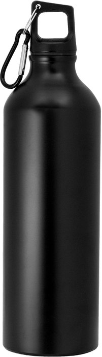 Botella de aluminio. Tapa a rosca plástica con anillo de silicona y con mosquetón (gancho carabinero) en color negro. Pintura color negro acabado mate.