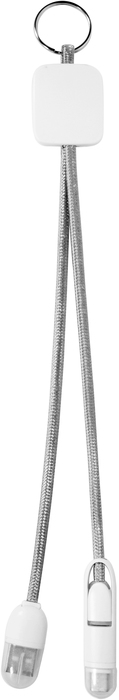 26,5 (medida total del cable con los adaptadores). 3 x 3,5 x 0,4 (medidas del cuadrado plástico donde se aplica el logo). Anillo para enganche o colocar llaves. Cargador tipo C y Iphone. Luz indicadora de carga del celular, cuando el color es rojo la batería del celular posee una carga menor al 50%, azul del 51 al 99% y verde cuando está totalmente cargada.