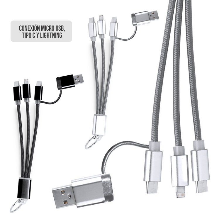 Cable cargador con conexión dual micro USB/Lightning y tipo C (entrada y salida). Conectores de aluminio y chapa especialmente diseñada para marcaje en láser. Conexión Micro USB, Tipo C y Lightning 5V DC 2.4A