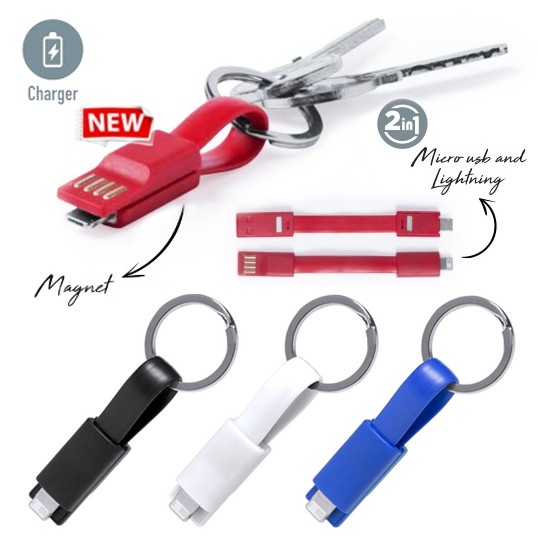Cargador llavero USB en variada gama de vivos colores. Con conexión dual micro USB/lightning. Presentado en bolsa individual. Apto para transferir datos. Conexión Micro USB y Lightning 5V DC 1A