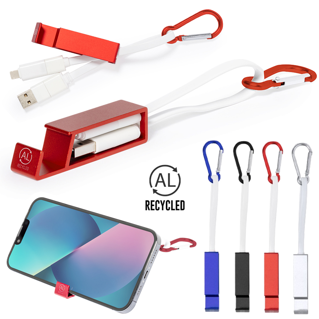 Cable cargador multifunción, fabricado en Aluminio Reciclado y con un ingenioso diseño que permite guardar los cables de carga cómodamente, además de facilitar el transporte. Incluye mosquetón a juego y soporte para smartphone, con conexión Tipo C (entrada y salida) y dual Micro USB / Lightning. En varios colores de acabado metalizado y con logotipo Aluminio Reciclado. Presentado en atractiva bolsa reciclada individual. El Aluminio Reciclado es un material con posibilidades de reciclaje casi infinitas, sin perder sus propiedades originales y consumiendo menos energía en este proceso. Certificación GRS (Global Recycled Standard / Estándar de Reciclaje Global), que garantiza el origen reciclado del material usado para fabricar el producto. Conexión Micro USB, Tipo C y Lightning 5V DC 2.4A