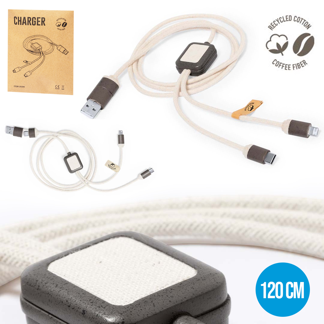 Cable cargador fabricado en fibra de café, con cables recubiertos en algodón reciclado. Conexiones de entrada Tipo C y USB, con salidas Tipo C, Lightning y Micro USB. 5V DC 2.4A. Con distintivos de fibra de café y algodón reciclado. Presentado en bolsa individual de diseño kraft con autocierre.La fibra de café es una solución circular que se obtiene de la utilización de los residuos producidos en la obtención del café. Una alternativa sostenible que favorece la reducción del uso de plásticos, ahorrando energía en su proceso de fabricación y contribuyendo al cuidado del medio ambiente. Disponible certificación GRS (Global Recycled Standard / Estándar de Reciclaje Global), que garantiza el origen reciclado del material usado para fabricar el producto. Conexión Micro USB, Tipo C y Lightning 5V DC 2.4A