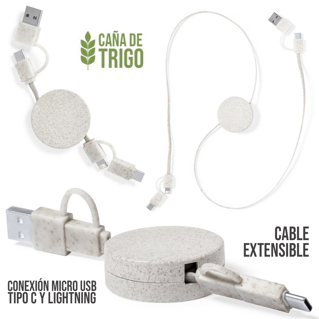 Cable cargador y sincronizador extensible, válido para cargar dispositivos y transferir datos. Fabricado en caña de trigo, para así fomentar la utilización de materias primas naturales y reducir las emisiones contaminantes. Pieza central con mecanismo interior extensible. Incluidas conexiones de entrada Tipo C y USB salidas Lightning, Micro USB y Tipo C. 5V DC 2.4A. Presentado en bolsa individual de diseño kraft. Apto para transferir datos. Cable Extensible. Conexión Micro USB, Tipo C y Lightning 9V DC 2.1A