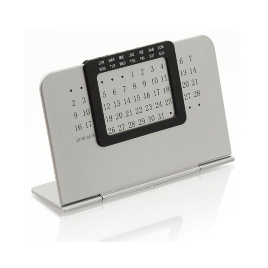 Calendario Eterno Plástico de escritorio, para todos los días, meses y años. Con ventana semanal móvil en español e inglés. Presentación en cajita plateada de regalo.
