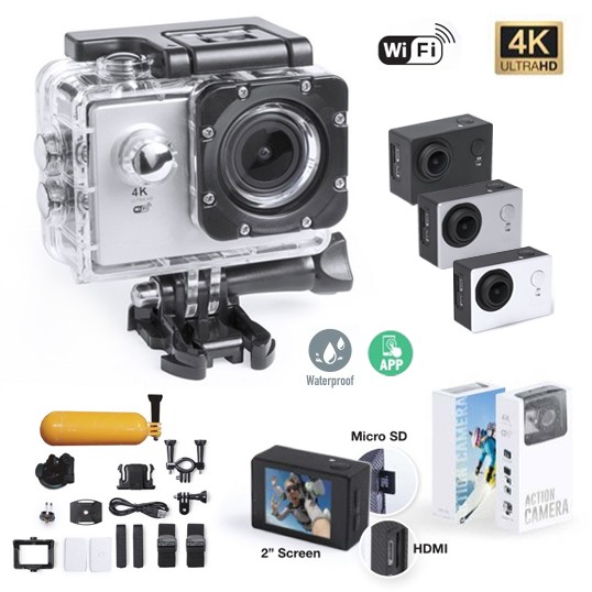 Cámara deportiva de alta calidad de captura de vídeo HD 4K, de diseño compacto y resistente, especialmente diseñada para uso intensivo. Incluye carcasa sumergible hasta 30m de profundidad y multitud de accesorios para ajuste en casco, manillar o cinturón, así como correas ajustables para cabeza y torso o un adaptador giratorio de 360º. La versatilidad y resistencia de esta cámara deportiva la convierten en el gadget perfecto para capturar, con una calidad excepcional, cualquier actividad deportiva. Con función cámara de fotos Full HD 1080p, ranura para tarjetas micro SD de hasta 64 GB de capacidad, pantalla LCD de 2 pulgadas, sistema multilenguaje, y recargable mediante cable mini USB -incluido-. Presentada en atractiva caja de diseño. 4K. Wifi. Pantalla LCD 2"". 16 Accesorios. Multilenguaje. Batería 900 mAh