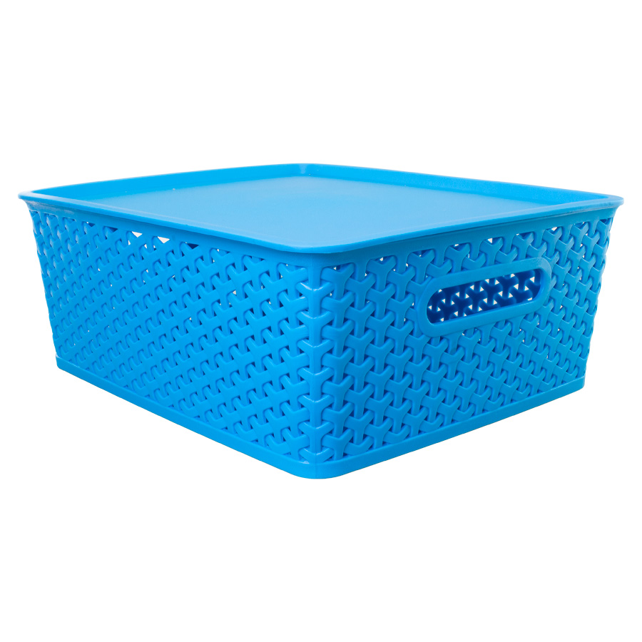 Canasto plástico organizador de 36.5 x 30 x 13.5 cm con tapa plástica. Diseño entrelazado tipo ratán. Capacidad 15 lt.