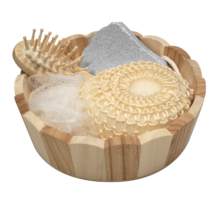 Canasto SPA de belleza en madera modelo "Naturals". Contiene cepillo de pelo, esponja malla, piedra pomez y esponja de masaje corporal.