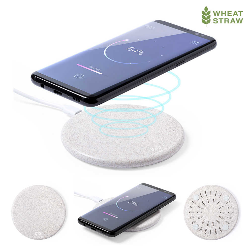 Cargador inalámbrico de diseño circular fabricado en caña de trigo, para así fomentar la utilización de materias primas naturales y reducir las emisiones contaminantes. Con función carga rápida de 10W e indicador led. Cable de carga micro USB incluido y compatible con dispositivos equipados con tecnología de carga inalámbrica. Protección de seguridad para evitar sobrecalentamiento, sobrecarga y cortocircuito. Presentado en atractiva caja de diseño nature. Inalámbrico 10W