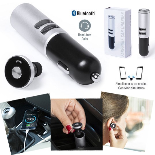Cargador USB de aluminio para mechero de coche. De 2.100 mAh de capacidad de carga. Auricular Bluetooth® manos libres integrado con panel de control, con tecnología de conexión simultánea a varios dispositivos. Salida USB dual que permite la carga simultánea de dos dispositivos móviles y sistema de fijación magnético para auricular. Tapa translúcida con led indicador de carga y presentado en caja individual. Conexión Bluetooth. 2 Salidas USB. 2100 mA