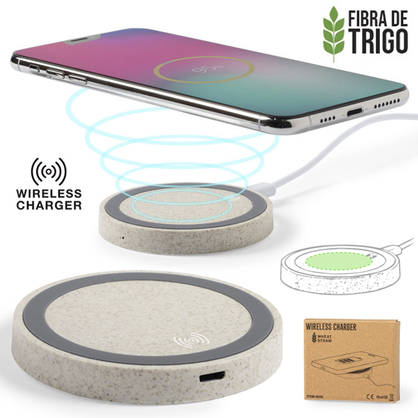 Cargador inalámbrico circular de línea nature. Carcasa en caña de trigo, para así fomentar la utilización de materias primas naturales y reducir las emisiones contaminantes. Con base antideslizante e indicador LED de estado de carga. Compatible con smartphones con tecnología de carga inalámbrica y presentado en atractiva caja de diseño eco. Inalámbrico 5W