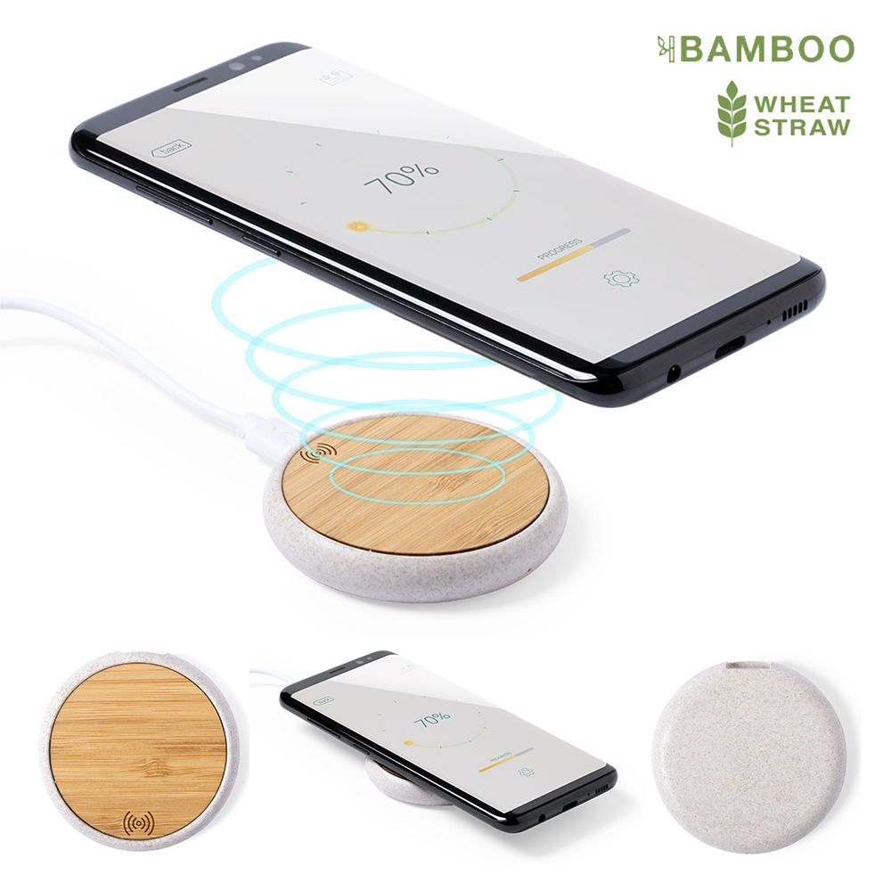 Cargador inalámbrico de diseño circular con superficie de carga en bambú y carcasa en caña de trigo, para así fomentar la utilización de materias primas naturales y reducir las emisiones contaminantes. Indicador led, con cable de carga micro USB incluido y compatible con dispositivos equipados con tecnología de carga inalámbrica. Protección de seguridad para evitar sobrecalentamiento, sobrecarga y cortocircuito. Presentado en atractiva caja de diseño nature. Inalámbrico 10W