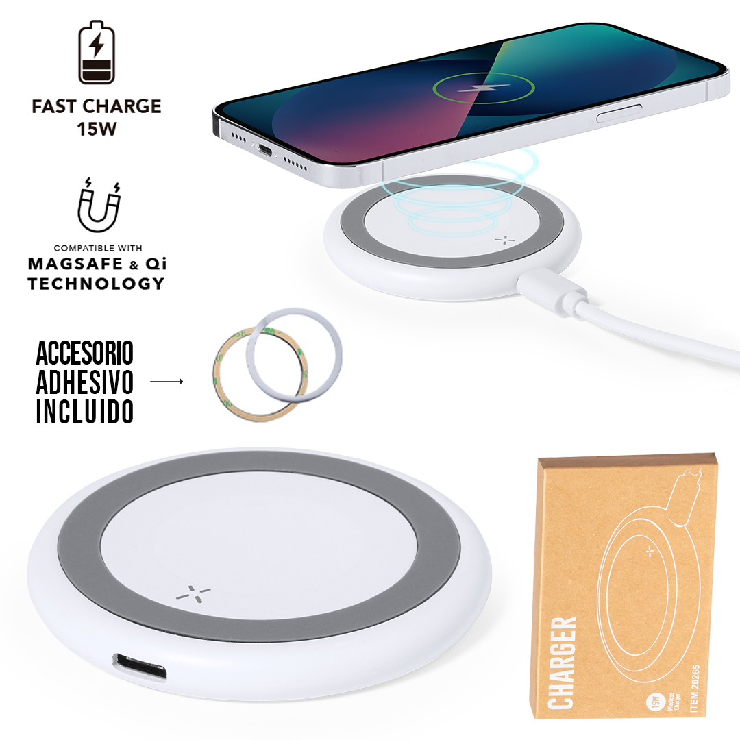 Cargador inalámbrico 15W de diseño circular. Base antideslizante y compatible con dispositivos equipados con tecnología de carga Qi. Diseñado para la carga de smartphone, auriculares y smartwatch. Presentado en atractiva caja de diseño kraft. Disponible manual en español e inglés. Inalámbrico 15W. Magnético
