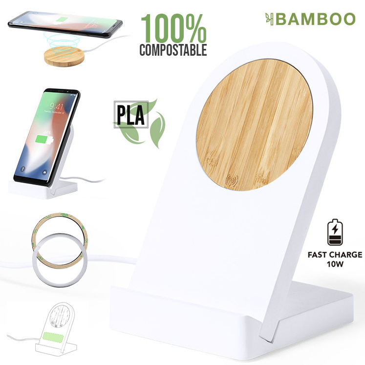Cargador inalámbrico magnético de línea nature con función soporte para móvil. Cargador inalámbrico fabricado en bambú, y carcasa en PLA -Ácido PoliLáctico-, que se obtiene a partir de recursos 100% naturales como el almidón de maíz, la yuca o la caña de azúcar, pudiendo convertirse en 100% compostable al final de su ciclo de vida útil. Con función carga rápida de 10W y compatible con dispositivos equipados con tecnología de carga inalámbrica. Incluye anilla metálica adhesiva. Cable con conexión USB de 100 cm. Amplia superficie de marcaje, presentado en atractiva caja de diseño eco.Distintivo PLA sobre el artículo. Inalámbrico 10W. Magnético