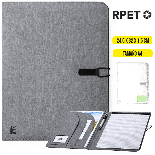 Elegante carpeta de línea nature tamaño A4. Fabricada en resistente 600D RPET efecto melange, elaborado a partir de plástico reciclado para así fomentar la reutilización de residuos plásticos y contribuir a la sostenibilidad del planeta. Detalles en negro y cierre metálico con cinta elástica especialmente diseñado para marcaje en láser. Interior con bloc extraíble de 20 hojas con disposición a una raya, 3 bolsillos de solapa, tarjeteros y soporte para bolígrafo. Distintivo RPET en esquina. Bloc 20 Hojas
