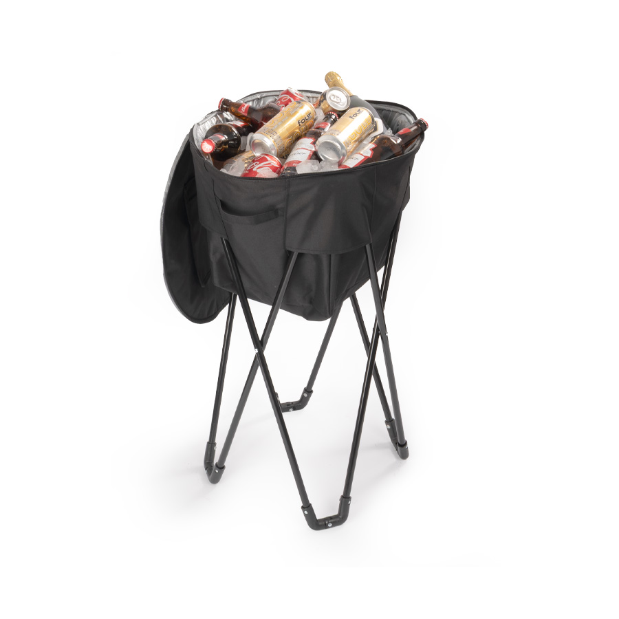 Bolso cooler grande de 50 litros de capacidad, en tela poliéster 600D/PVC. Interior térmico aislante de PEVA y acolchado con esponja PE FOAM. Cuenta con asas laterales para sujeción, cierre eclair 360°, ventana cuadrada con cierre velcro en la parte superior (tapa), para retiro ágil de productos y tapón de goma inferior para despiche de líquido acumulado dentro del cooler. Montado sobre estructura de patas metálicas plegables color negro, presentadas en bolsa de poliéster negro.