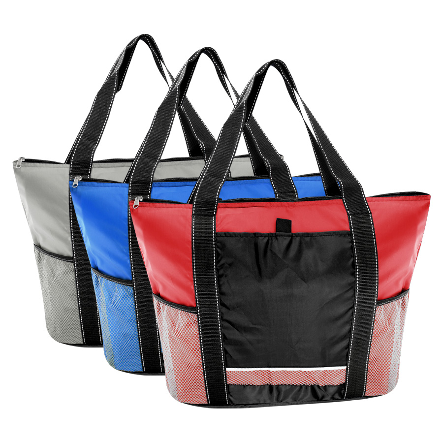 Cooler gigante modelo "Artic". Tela exterior Polyester 210D/PU. Tela interior plateada aislante 15C PEVA + relleno 6mm esponja PE. Cierre cremallera superior. Incluye bolsillo delantero para bordar + bolsillos laterales tela malla.